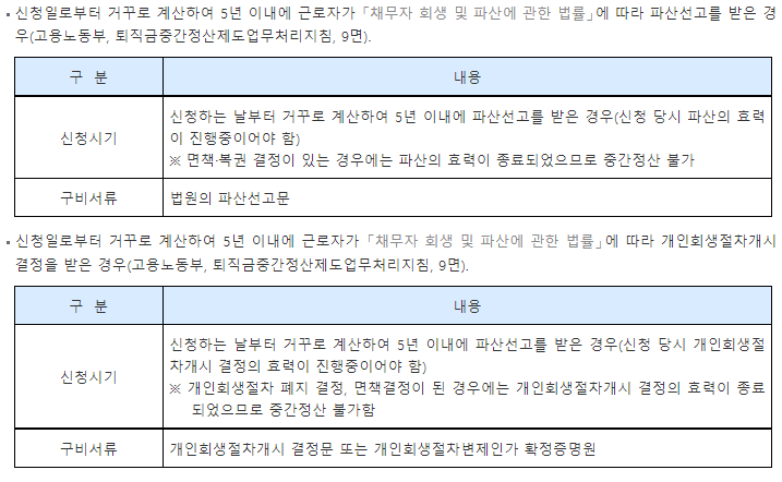 퇴직금 중간정산을 신청하는 날부터 거꾸로 계산하여 5년 이내에 근로자가 「채무자 회생 및 파산에 관한 법률」에 따라 파산선고를 받은 경우 퇴직금 중간정산을 신청하는 날부터 거꾸로 계산하여 5년 이내에 근로자가 「채무자 회생 및 파산에 관한 법률」에 따라 개인회생절차 개시 결정을 받은 경우