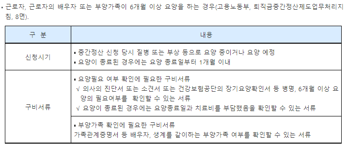 A1. ① 60세 이상의 직계존속, ② 20세 이하의 직계비속 또는 동거 입양자, ③ 20세 이하 또는 60세 이상인 형제자매 등이 부양가족에 해당됩니다. 이 경우 「소득세법」제50조 제1항의 부양가족 범위를 판단함에 있어 소득 수준은 고려하지 않습니다(고용노동부, 퇴직금 중간정산제도 업무처리지침, 7면).