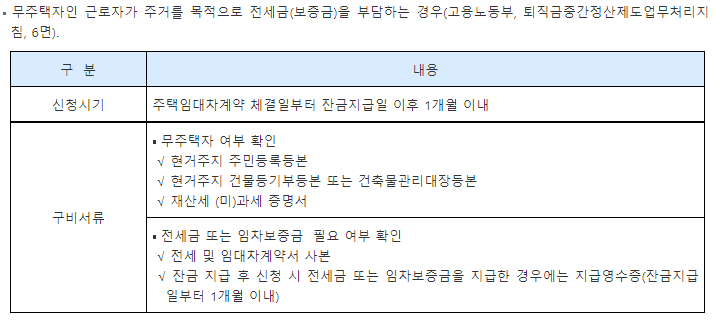 A1. 주거목적의 전세금으로서 「민법」 제303조에 따른 전세금 또는 「주택임대차 보호법」제3조의 2에 따른 임차보증금의 경우에는 임대차 계약 상 보증금으로 전세보증금 뿐만 아니라 월세보증금도 포함 됩니다(고용노동부, 퇴직금중간정산제도업무처리지침, 5면).
