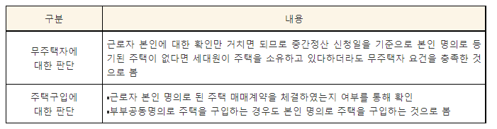 A1. 무주택자 여부 및 주택구입 여부에 대한 판단기준은 다음과 같습니다(고용노동부, 퇴직금 중간정산제도 업무처리지침, 3면).