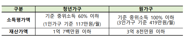 소득재산 : 청년 가구뿐만 아니라 청년과 부모를 포함한 원가구의 소득 및 재산이 모두 일정 기준을 충족해야 한다.